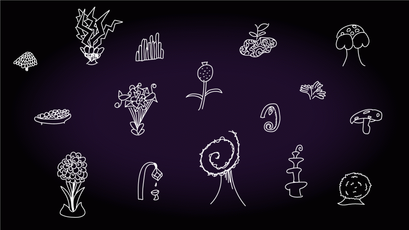 Our early plant designs were fleshed out via prototypes and, with those, we designed a miniature garden experience that some fellow classmates participated in for some initial UX testing. It was certainly a challenge to translate the interactions we observed from a tiny setup in the corner of a bright classroom to a large dark studio space. Nevertheless, we noticed with our small plant prototypes that our participants were mostly looking down at their feet. We decided it was important to make the actual plants much larger, in order to guide a participant’s gaze up toward the animations that would be projected behind them.