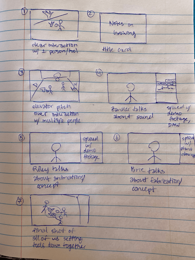 After a semester of dedicated work, seeing it all together in the Black Box was thrilling. Up until recently, we’ve only been able to work the installation in bits and pieces, as time in the studio is preciously limited. At last, the world we created was truly immersive and fully responsive, a garden of sound complemented beautifully by lighting and animations, made real by our note-covered sculptures and tools.